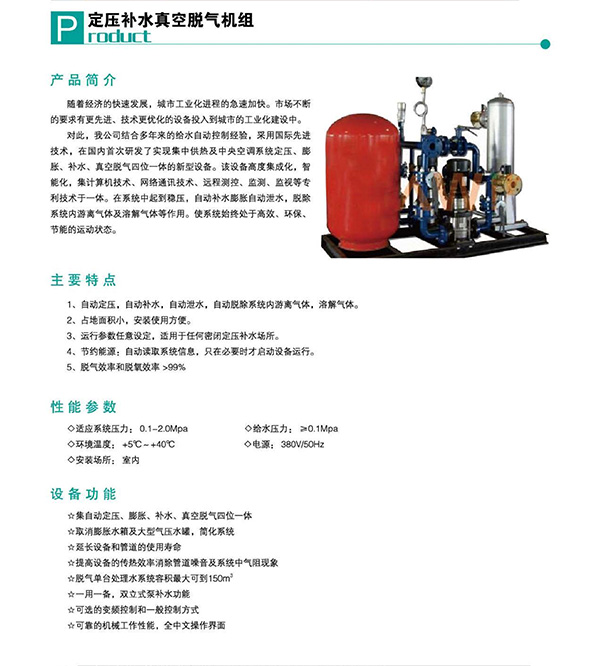 定壓補(bǔ)水脫氣裝置是我公司采用國(guó)際先進(jìn)技術(shù)研發(fā)的實(shí)現(xiàn)集中供熱及中央空調(diào)系統(tǒng)定壓、膨脹、補(bǔ)水、真空脫氣四位一體的新型設(shè)備。該設(shè)備在系統(tǒng)中起到穩(wěn)壓、自動(dòng)補(bǔ)水、膨脹自動(dòng)泄水,脫除系統(tǒng)內(nèi)游離氣體及溶解氣體等作用。使系統(tǒng)始終處于高效、環(huán)保、節(jié)能的運(yùn)動(dòng)狀態(tài)。