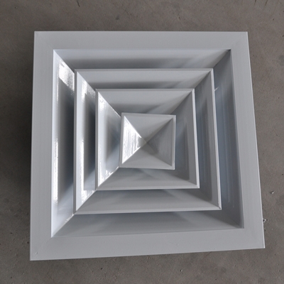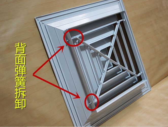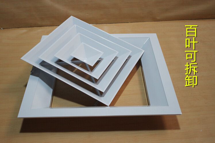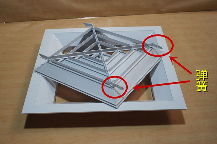 方型散流器使用該類型散流器時(shí)要與調(diào)節(jié)閥配合使用,才能在系統(tǒng)中得到理想的氣流分布。此風(fēng)口的葉片角度為固定式,不能隨意調(diào)節(jié),整個葉片與邊框采用分離結(jié)構(gòu)